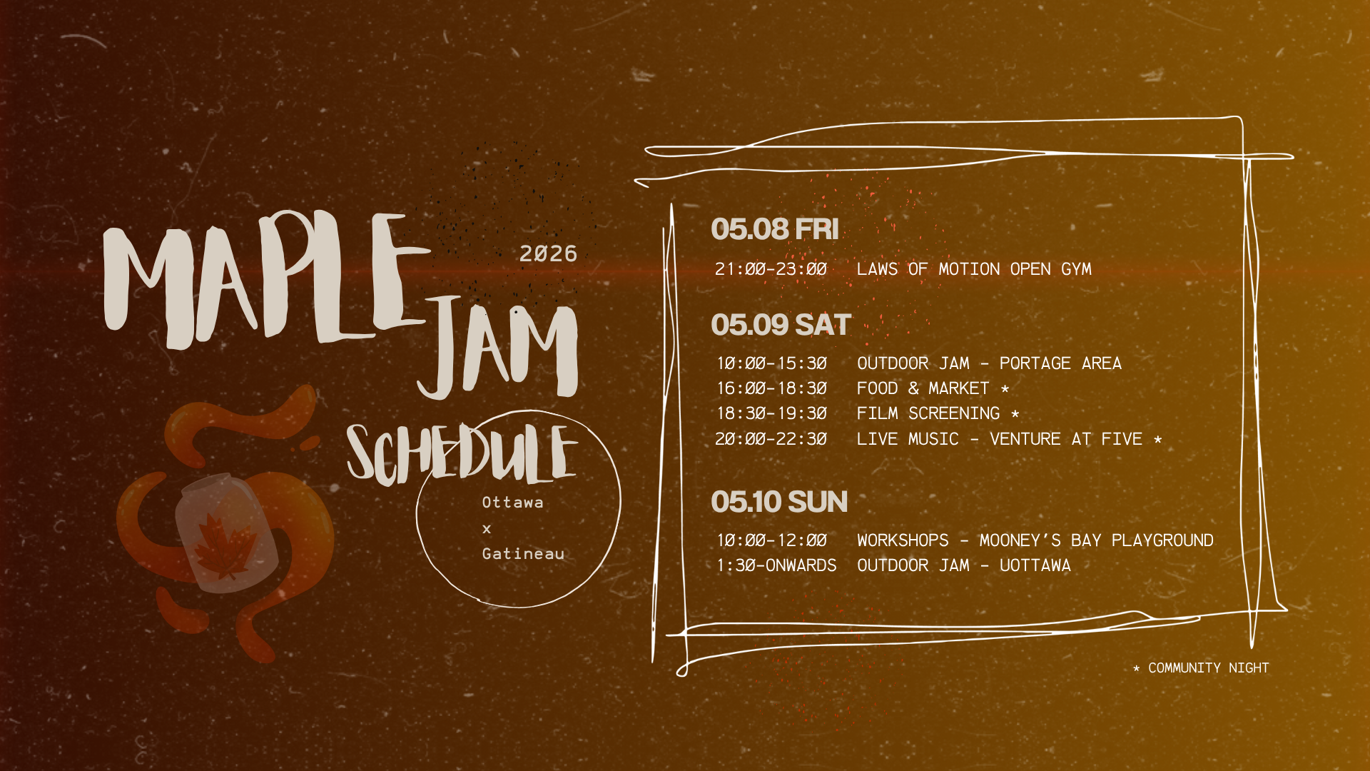 It's a national gathering for parkour community across Canada to share, learn and support each other through open jams, a Canadian parkour film screening, workshops, and a community market.